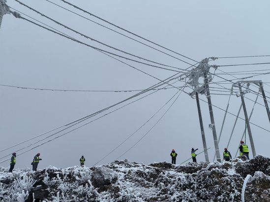面對(duì)突發(fā)險(xiǎn)情,項(xiàng)目部緊急啟動(dòng)冬季凝凍災(zāi)害應(yīng)急處置預(yù)案,一場(chǎng)與冰雪搶時(shí)間的“破冰行動(dòng)”迅即展開(kāi):一是通路保暢,搶險(xiǎn)隊(duì)員迅速在項(xiàng)目部周邊通行道路撒布除雪劑,清除路面冰層,為人員和搶險(xiǎn)設(shè)備通行開(kāi)辟安全通道;二是精準(zhǔn)除冰,電工確認(rèn)切斷主線路電源并做好安全隔離措施后,搶修人員立即對(duì)高壓線路絕緣端子及覆冰嚴(yán)重部位開(kāi)展精準(zhǔn)除冰作業(yè),嚴(yán)防因冰層持續(xù)增厚引發(fā)更大范圍線路故障;三是應(yīng)急保供,物資保障組同步調(diào)度2臺(tái)備用發(fā)電機(jī),優(yōu)先保障辦公區(qū)和員工生活區(qū)的應(yīng)急用電,最大限度降低停電影響。