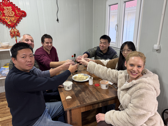 當(dāng)熱氣蒸騰的餃子出鍋時(shí),中外員工舉筷分享。項(xiàng)目經(jīng)理吳時(shí)光端著餃子與大家共話:“這圓潤(rùn)的餃子,象征圓滿,也象征我們團(tuán)隊(duì)的團(tuán)結(jié)。感謝每位中塞同事的堅(jiān)守,是你們讓萬(wàn)里之外有了家的溫暖?!?/p>
