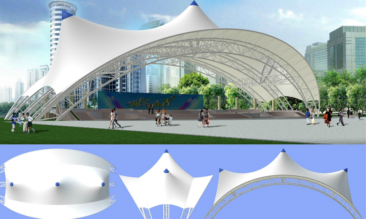 1、舞臺張拉膜結構的共同曲面外形使其具有激烈的雕塑感,膜面經過張力到達自平衡。